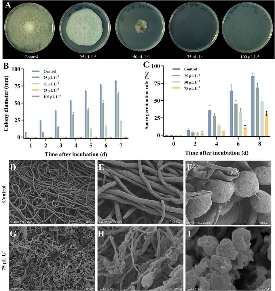 图4. 芳樟醇处理对褐腐病菌(Monilinia fructicola)菌丝生长(A)、菌落直径(B)、孢子萌发率(C)及菌丝超微结构(D)的影响。褐腐病菌菌丝经不同浓度芳樟醇(0、25、50、75、100 μL・L⁻¹)处理后,于 25℃培养;菌丝超微结构通过扫描电子显微镜(SEM)观察(处理组为 75 μL・L⁻¹ 芳樟醇熏蒸处理,对照组无处理,均于 25℃培养)。误差线代表标准误差;每组数据为三次重复测量的均值。