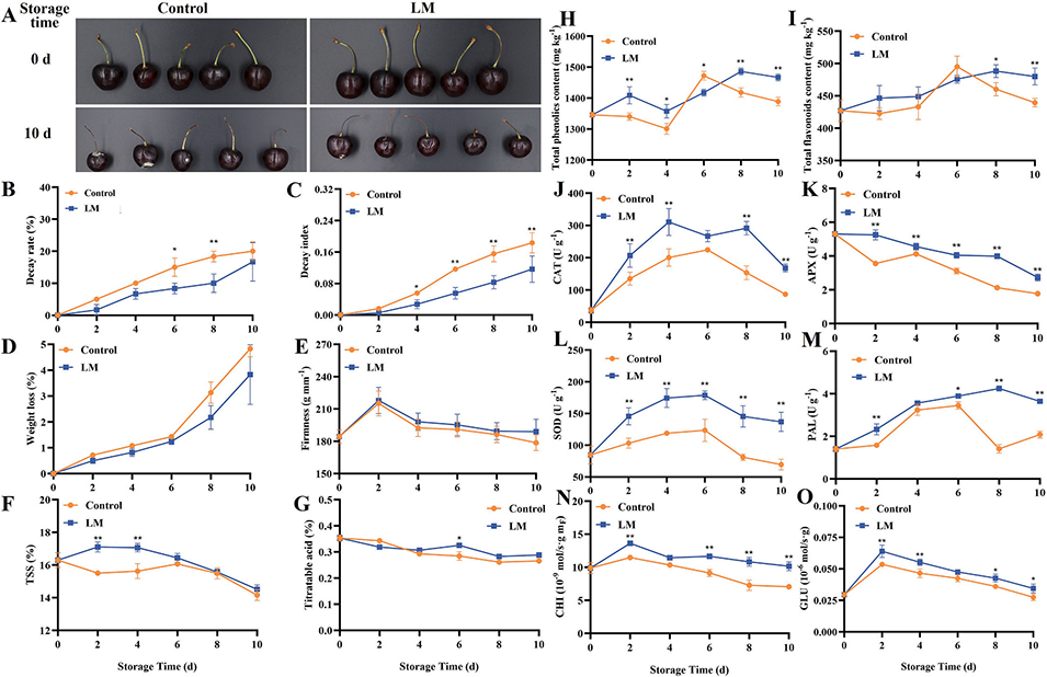 图3. 芳樟醇微胶囊(LMs)在 “胜利” 樱桃保鲜中的应用效果。A 为樱桃贮藏期间的外观变化;B 为腐烂率;C 为腐烂指数;D 为失重率;E 为硬度;F 为总可溶性固形物(TSS)含量;G 为可滴定酸(TA)含量;H 为总酚含量;I 为总黄酮含量;J 为过氧化氢酶(CAT)活性;K 为抗坏血酸过氧化物酶(APX)活性;L 为超氧化物歧化酶(SOD)活性;M 为苯丙氨酸解氨酶(PAL)活性;N 为几丁质酶(CHI)活性;O 为葡聚糖酶(GLU)活性。樱桃经 LMs 处理或空白对照后,于 20℃±0.5℃条件下贮藏 10 d。误差线代表标准误差;每组数据为三次重复测量的均值;采用 Tukey 检验分析,统计学差异标注如下:*P < 0.05(显著差异),**P < 0.01(极显著差异)。