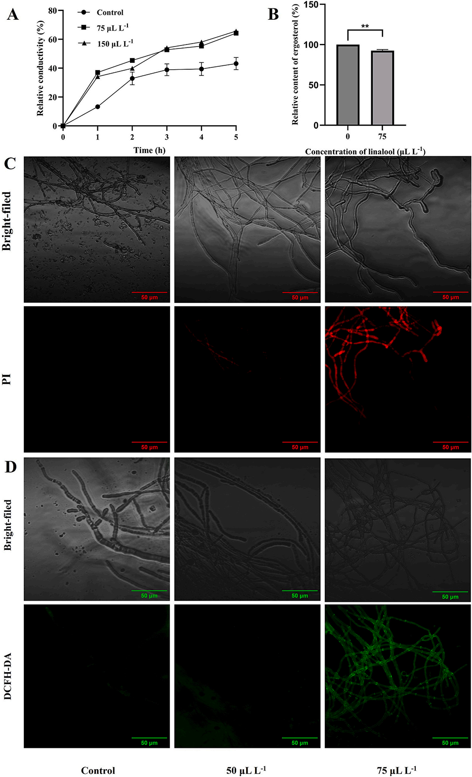 图5. 芳樟醇对褐腐病菌(Monilinia fructicola)细胞膜完整性及活性氧(ROS)积累的影响。A 为相对电导率;B 为麦角甾醇含量;C 为碘化丙啶(PI)染色结果;D 为 2′-7′- 二氯二氢荧光素二乙酸酯(DCFH-DA)染色结果。褐腐病菌菌丝经不同浓度芳樟醇(0、50、75 μL・L⁻¹)处理后,于 25℃培养。