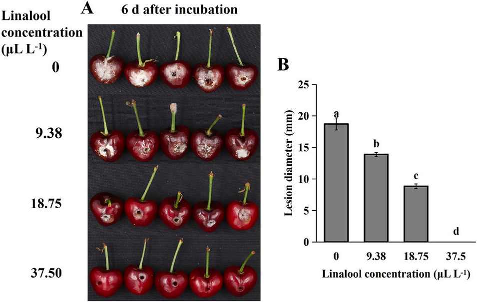 图6. 芳樟醇对 “美早” 樱桃褐腐病(由褐腐病菌 Monilinia fructicola 引起)的防治效果。A 为接种病菌 6 d 后樱桃的病害症状;B 为芳樟醇对接种褐腐病菌樱桃病斑直径的影响。误差线代表标准误差;每组数据为三次重复测量的均值;不同小写字母表示组间差异显著(P<0.05,Tukey 检验)。