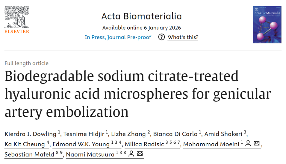 近期,加拿大多伦多大学研究团队通过引入柠檬酸钠处理技术,在交联前调控HA链的排列与相互作用,成功制备出粒径适宜、力学强度增强且降解时间可调的HA微球。该微球在体外实验中表现出良好的栓塞稳定性和细胞相容性,为GAE提供了一种极具潜力的可降解栓塞剂选项。相关研究以“Biodegradable sodium citrate-treated hyaluronic acid microspheres for genicular artery embolization”为题目,发表在期刊《Acta Biomaterialia》上。