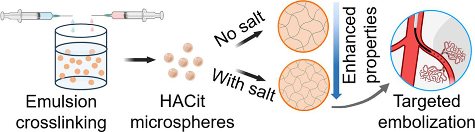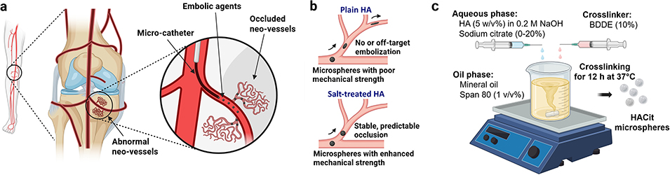 图1.(a)膝动脉栓塞术(GAE)通过微导管递送栓塞剂,选择性阻塞异常新生血管。(b)栓塞剂需具备特定机械强度以确保稳定阻塞。机械强度不足的微球(如普通透明质酸微球)质地过软,无法抵抗血压和剪切力,易发生显著变形,导致无法稳定阻塞或出现脱靶栓塞;而经盐处理的透明质酸微球等质地更坚硬的微球可避免该问题。(c)通过乳液交联法制备 HACit 微球。