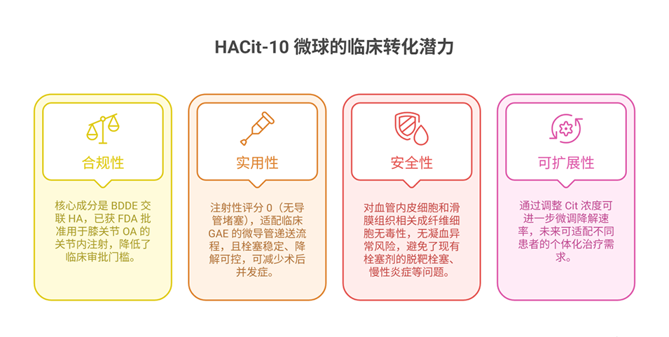 3、优化后的HACit-10微球(10%Cit处理)具有理想特性:粒径在75-300 μm(平均151±53 μm),符合GAE需求;机械强度增强,能稳定阻塞微通道;体外降解时间约56±4 h,契合临时栓塞的治疗窗口;经NMR验证柠檬酸钠完全去除,仅含FDA批准的BDDE交联HA;对人脐静脉内皮细胞(HUVECs)和人真皮成纤维细胞(HDFs)具有良好细胞相容性,且注射性佳、无导管堵塞风险。