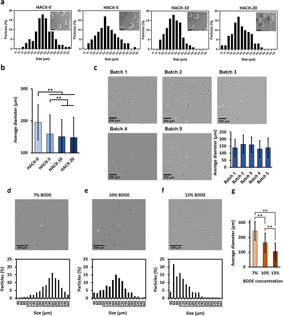 图2.(a)HACit 微球的粒径分布。插图为代表性光学显微镜图像(比例尺:200 µm)。(b)HACit 微球的平均直径,每组至少测量 600 个微球。(c)5 个独立批次 HACit-10 微球的形态和平均粒径,体现批次一致性(比例尺:200 µm),每批至少测量 800 个微球。(d-f)BDDE 浓度对 HACit-10 微球形态和粒径分布的影响(比例尺:300 µm)。(g)不同 BDDE 浓度制备的 HACit-10 微球平均粒径,每组至少测量 800 个颗粒。柱状图数据以 “平均值 ± 标准差” 表示,**p<0.01。