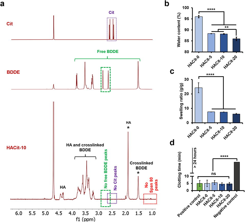 图3.(a)游离柠檬酸钠(Cit)、游离 1,4 - 丁二醇二缩水甘油醚(BDDE)及 HACit-10 微球在氘代水(D₂O)中的核磁共振(¹H-NMR)光谱。(b)HACit 微球在 37℃ PBS 中达到平衡溶胀后的含水量。(c)HACit 微球在 37℃ PBS 中达到平衡溶胀后的溶胀比。(d)HACit 微球与牛血浆在 37℃孵育后的凝血时间。柱状图数据以 “平均值 ± 标准差” 表示,N=3,**p<0.01,****p<0.0001。
