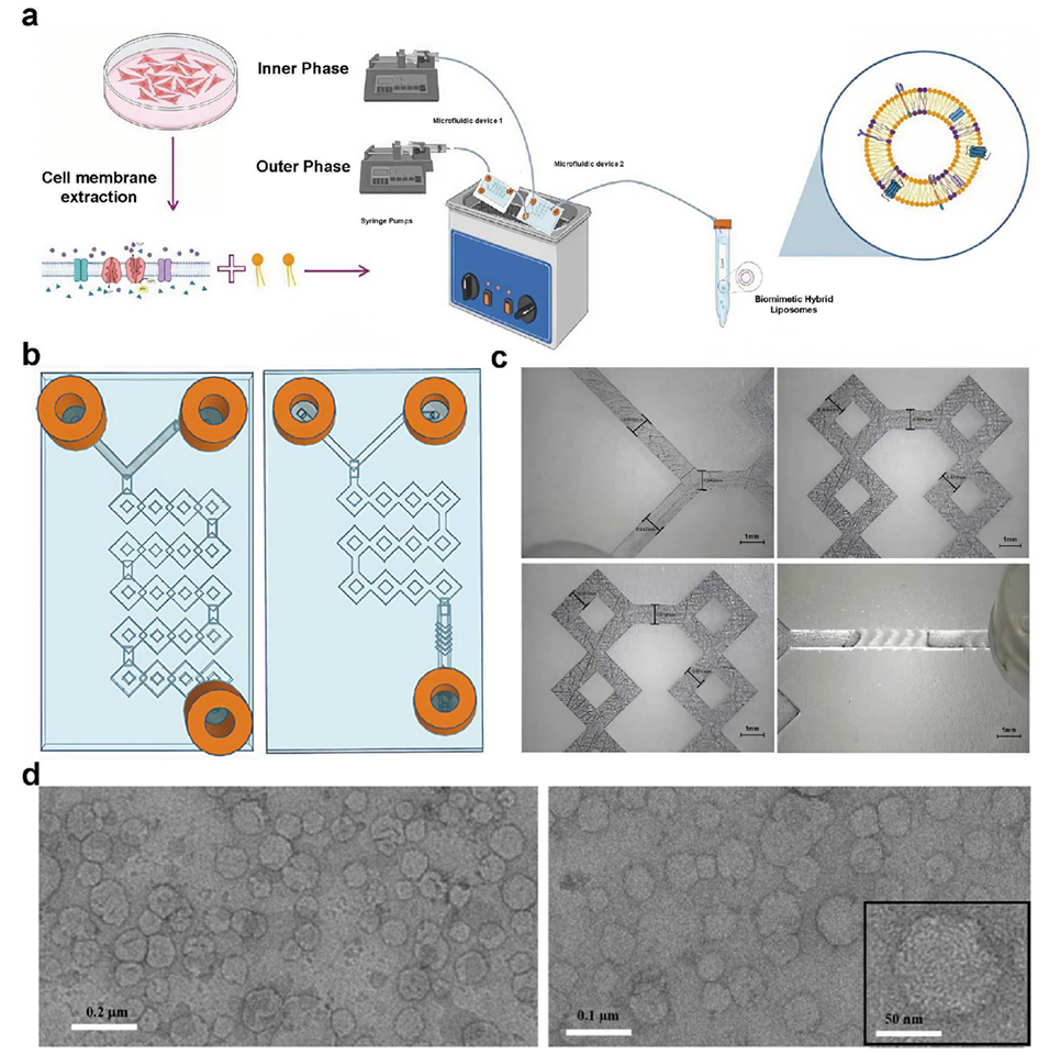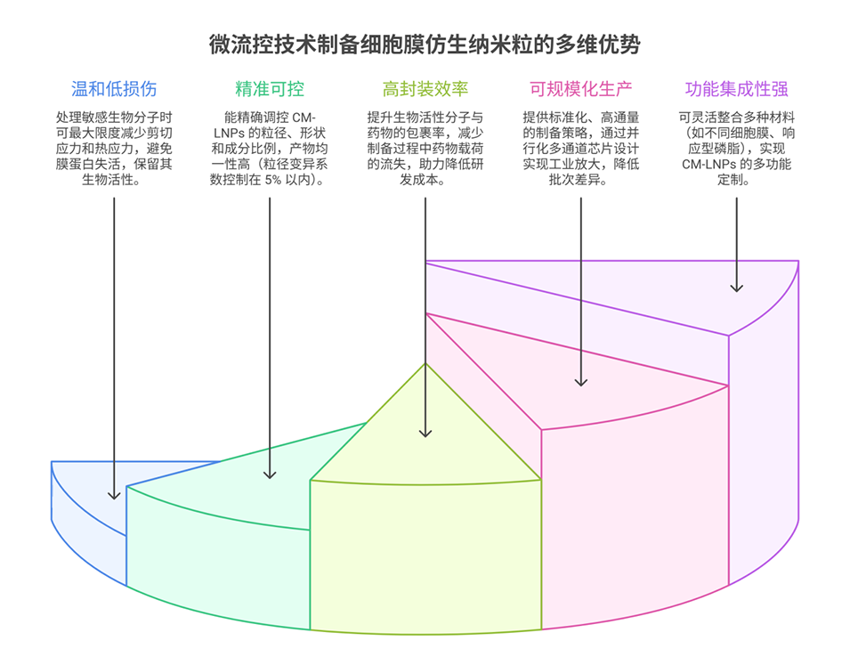 为进一步提升载体的多功能性与制备精准性,细胞膜杂化脂质纳米粒(CM-LNPs)应运而生,其融合天然细胞膜的生物特性与合成磷脂的工程可调性,而微流控技术的发展为CM-LNPs的高效、规模化精准制备提供了新路径,推动该领域向临床转化迈进。