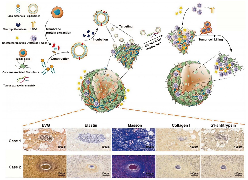 图2 膜蛋白与磷脂构建的弹性蛋白酶修饰仿生脂质体用于增强肿瘤化学免疫治疗的示意图