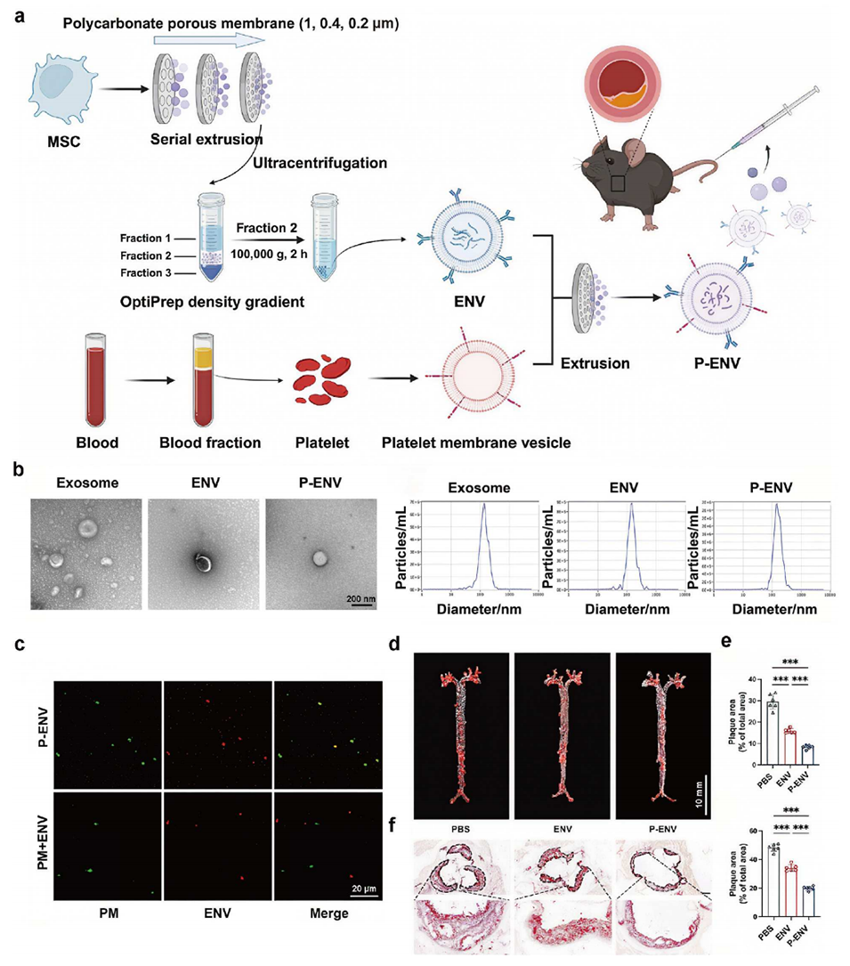 图5 挤出法制备 P-ENVs(血小板膜包被外泌体模拟纳米囊泡)及其在动脉粥样硬化治疗中的靶向递药作用