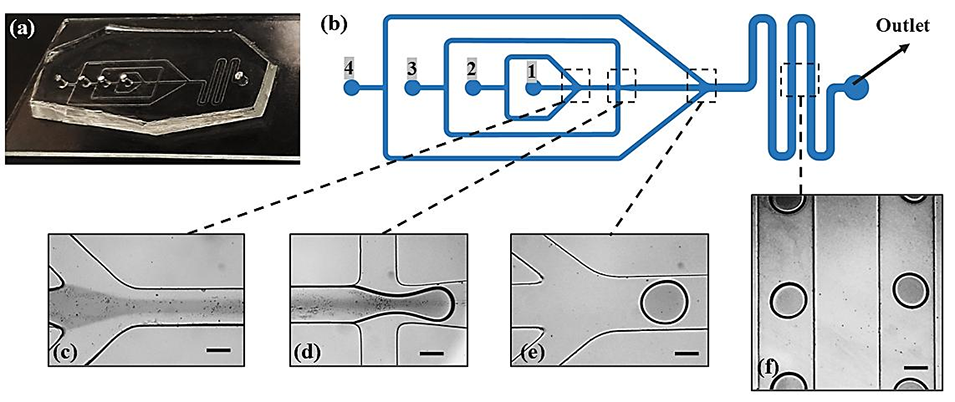 图1.(a)用于制备核壳型微胶囊的微流控装置示意图。(b)流动聚焦装置的结构示意图:入口 1 注入含液体食用色素的去离子水,入口 2 注入不同浓度海藻酸钠与 Ca-EDTA 组成的壳溶液,入口 3 注入含 3 wt% 司盘 80 的矿物油,入口 4 注入含 3 wt% 司盘 80 与 1%(v/v)乙酸的矿物油。(c)第一个交汇口,用于形成核壳型流体。(d)液滴生成单元。(e)第三个交汇口,用于原位交联。(f)酸渗透稳定段。比例尺为 200 µm。