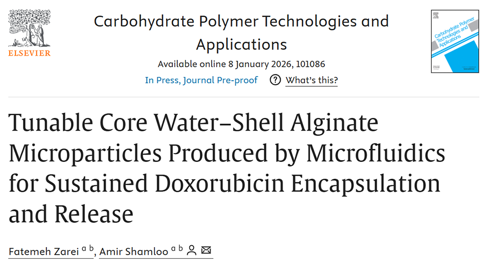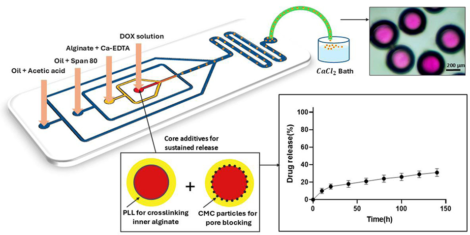 为解决传统化疗药物阿霉素临床应用中副作用显著、释放不可控的问题,近期,谢里夫理工大学研究人员基于微流控技术制备了一种可调水核-海藻酸盐壳微粒,用于实现抗癌药阿霉素的持续封装与释放。该研究通过优化各相流速、装置交汇口宽度、壳层组成,并引入羧甲基纤维素颗粒与ε-聚L-赖氨酸协同增强药物滞留,使包封率提升至92%以上,释放时间延长至超过120小时。相关研究以“Tunable Core Water–Shell Alginate Microparticles Produced by Microfluidics for Sustained Doxorubicin Encapsulation and Release”为题目,发表在期刊《Carbohydrate Polymer Technologies and Applications》上。