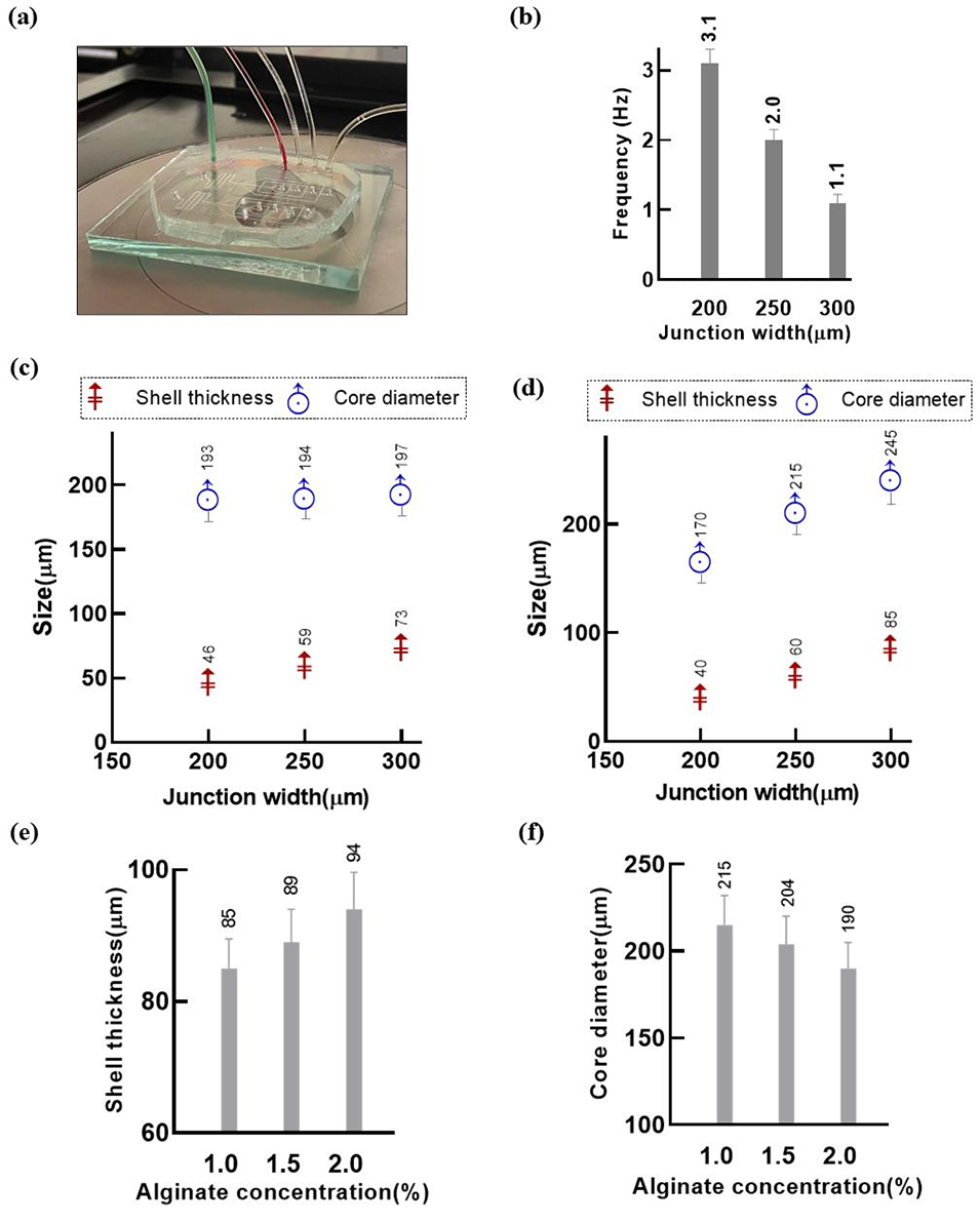 图3.(a)不同交汇口宽度的流动聚焦装置。(b)壳相流速 = 0.1 μL/min、核相流速 = 0.4 μL/min、油相流速 = 3 μL/min 时,核壳颗粒的生成频率。(c)壳相和核相流速均为 0.1 μL/min、油相流速 = 2 μL/min 时,不同装置的壳厚度和核直径对比。(d)壳相和核相流速均为 0.3 μL/min、油相流速 = 4 μL/min 时,不同装置的壳厚度和核直径对比。误差线代表标准差;壳厚度的标准差过小,在图中无法直观区分。(e)(f)在交汇口宽度为 300 µm、壳相和核相流速均为 0.3 μL/min、油相流速 = 4 μL/min 时,海藻酸盐浓度对壳厚度(e)和核直径(f)的影响。误差线代表标准差。