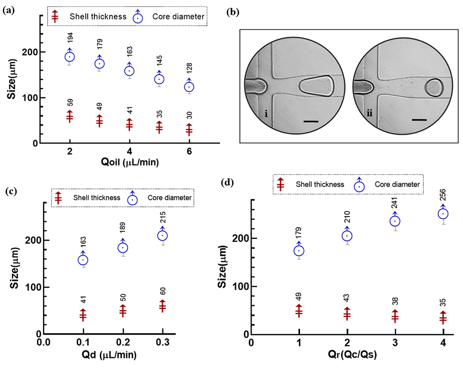 图2.(a)在壳相和核相流速均为 0.1 μL/min 时,油相流速对壳厚度和核直径的影响。(b)壳相和核相流速均为 0.3 μL/min 时的核壳颗粒形成情况:(i)油相流速 = 3 μL/min;(ii)油相流速 = 4 μL/min。比例尺为 150 µm。(c)油相流速 = 4 μL/min 时,分散相流速对壳厚度和核直径的影响。(d)壳相流速 = 0.1 μL/min、油相流速 = 3 μL/min 时,核相流速对核尺寸和壳尺寸的影响。误差线代表测量值的标准差;壳厚度的标准差过小,在图中无法直观区分。