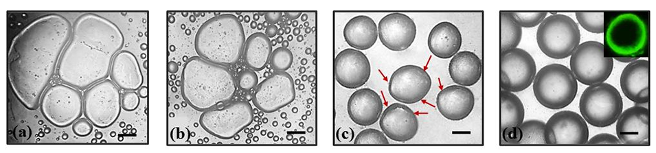 图4. 不同壳溶液组成制备的核壳微凝胶形态:(a)1%(w/v)海藻酸钠 + 1%(w/v)Ca-EDTA;(b)2%(w/v)海藻酸钠 + 1%(w/v)Ca-EDTA,两者均出现微凝胶融合或坍塌现象。(c)1%(w/v)海藻酸钠 + 2%(w/v)Ca-EDTA,部分微凝胶发生变形(红色箭头标注变形区域)。(d)2%(w/v)海藻酸钠 + 2%(w/v)Ca-EDTA,形成高度单分散且球形度优良的液滴,激光共聚焦显微镜下可清晰观察到经荧光素染色的壳层。比例尺为 150 µm。所有条件下的流速保持一致:壳相和核相流速均为 0.3 μL/min,油相流速 = 4 μL/min,油/酸混合相流速 = 3 μL/min。