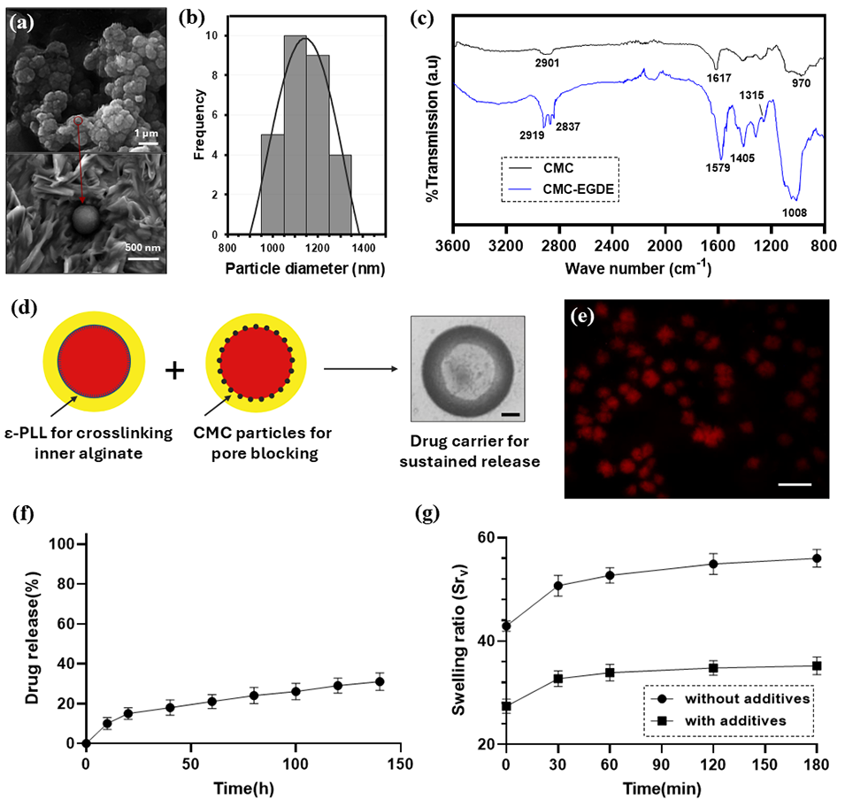 图6.(a)经乙二醇二缩水甘油醚(EGDE)交联的干燥羧甲基纤维素(CMC)颗粒的 FE-SEM 图像(上图),平均直径为 435±20 nm;交联海藻酸盐表面的 CMC 颗粒 FE-SEM 图像(下图),显示其孔隙封堵潜力。(b)CMC 颗粒在蒸馏水中溶胀后的动态光散射(DLS)粒径分布直方图,平均直径为 1143±31 nm。(c)纯 CMC(黑色)与 EGDE 交联 CMC 颗粒(CMC-EGDE,蓝色)的 FTIR 光谱,证实交联成功。(d)核相中添加 0.15%(w/v)CMC 颗粒(封堵海藻酸盐孔隙)和 0.07%(w/v)ε- 聚 - L - 赖氨酸(ε-PLL,促进壳内层凝胶化)以实现缓释的策略示意图。(e)核相添加添加剂后制备的载药微凝胶荧光强度图,表明药物保留率高。(f)添加 CMC 颗粒和 ε-PLL 后,核壳型药物载体在 140 小时内的 DOX 缓释曲线,显示界面修饰效果显著。(g)添加添加剂前后微载体的体积溶胀特性,含添加剂的药物载体溶胀程度更低。误差线代表标准差。
