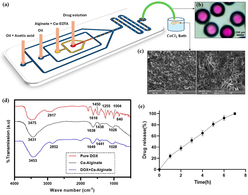 图5.(a)核壳型药物载体的制备流程示意图:入口 1 注入含 100μg/mL 阿霉素(DOX)的去离子水(核相流速 = 0.3 μL/min),入口 2 注入含 2%(w/v)海藻酸钠与 2%(w/v)Ca-EDTA 的溶液(壳相流速 = 0.3 μL/min),入口 3 注入含 3 wt% 司盘 80 的矿物油(油相流速 = 4 μL/min),入口 4 注入含 3 wt% 司盘 80 与 1%(v/v)乙酸的矿物油(油/酸混合相流速 = 3 μL/min)。(b)从装置中提取的药物载体(部分凝胶化),直径为 370±22 µm。(c)经氯化钙凝胶化后载体表面的场发射扫描电子显微镜(FE-SEM)图像,显示多孔表面形貌。(d)纯 DOX(红色)、氯化钙交联海藻酸盐(Ca-Alginate,黑色)及核含 DOX 溶液、壳为氯化钙交联海藻酸盐的微载体(DOX+Ca-Alginate,蓝色)的傅里叶变换红外(FTIR)光谱,表明药物与聚合物存在相互作用。(e)7 小时内核壳型药物载体的 DOX 释放曲线,显示壳层凝胶化可增强扩散阻力。误差线代表标准差。