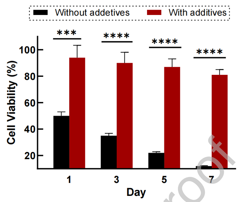 图7. 7 天内,经含添加剂(CMC 颗粒和 ε-PLL)与不含添加剂的核壳型药物载体处理后的细胞存活率对比。误差线代表数据的标准差。