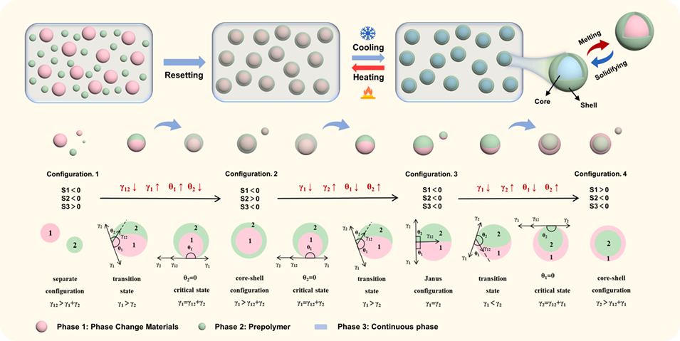 核心是通过界面张力的内在关系驱动乳液构型优化:当满足“核相-连续相的界面张力>核相-壳层相的界面张力+壳层相-连续相的界面张力”时,壳层相(中间相)会自发包裹核相(相变材料),形成热力学稳定的核-壳型双乳液(o/o/w结构),避免传统两相乳液需大量表面活性剂稳定、易分层的问题。