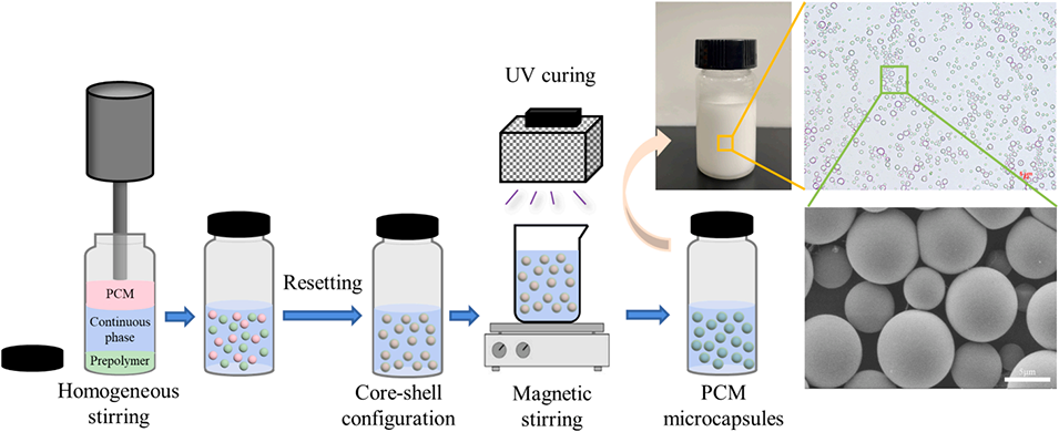 通过紫外光固化(如HDDA的光诱导自由基聚合),将双乳液模板中的壳层单体(中间相)交联形成致密的聚合物壳膜,永久固定核-壳结构,最终得到“相变材料核心-聚合物壳层”的相变微胶囊。固化过程不破坏核相完整性,且能精准保留双乳液的核-壳构型,实现相变材料的无泄漏封装。