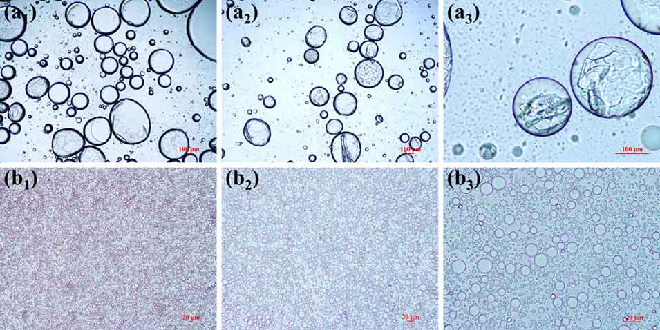 图3 2wt% PVA水溶液中,经简单手摇(a₁, a₃)和实验室均质机(b₁, b₃)制备的、被HDDA完全包裹的微粒偏光显微镜(POM)图像