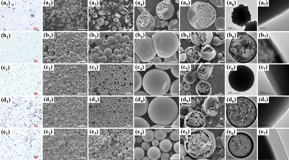 图5 不同正十八烷(C₁₈)与HDDA体积比制备的相变微胶囊的光学显微镜照片(a₁至e₁)、SEM形貌图(a₂-a₅至e₂-e₅)及透射电子显微镜(TEM)显微结构图(a₆-a₇至e₆-e₇):(a₁至a₇) 1:0.1;(b₁至b₇) 1:0.3;(c₁至c₇) 1:0.5;(d₁至d₇) 1:0.7;(e₁至e₇) 1:0.9