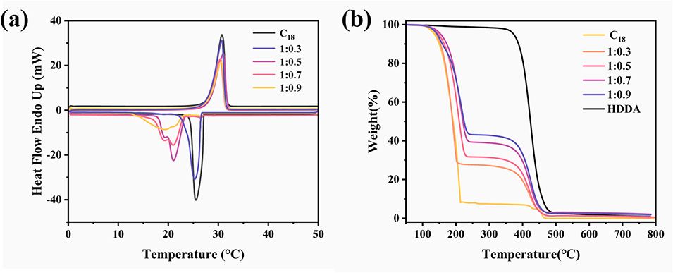 图7(a)C₁₈及不同核-壳比相变微胶囊的差示扫描量热(DSC)曲线(1:0.3、1:0.5、1:0.7、1:0.9分别对应图5中b至e所示微胶囊);(b)C₁₈、相变微胶囊及HDDA的热重分析(TGA)曲线