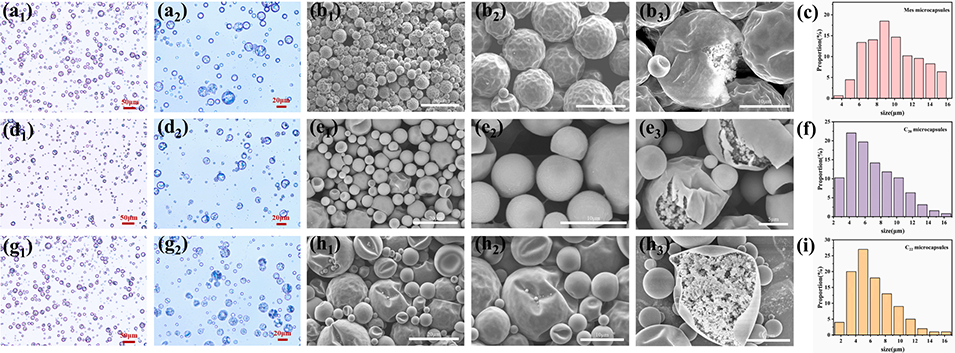 图8 硬脂酸甲酯(Mes)(a₁至a₂)、正二十烷(C₂₀)(d₁至d₂)及正二十二烷(C₂₂)(g₁至g₂)微胶囊的偏光显微镜(POM)图像;不同放大倍数下Mes(b₁至b₃)、C₂₀(e₁至e₃)及C₂₂(h₁至h₃)微胶囊的SEM图像;Mes(c)、C₂₀(f)及 C₂₂(i)微胶囊的粒径分布图