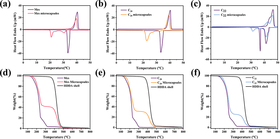 图10 Mes(a)、C₂₀(b)及 C₂₂(c)微胶囊的差示扫描量热(DSC)曲线;Mes(d)、C₂₀(e)及 C₂₂(f)微胶囊的热重分析(TGA)曲线
