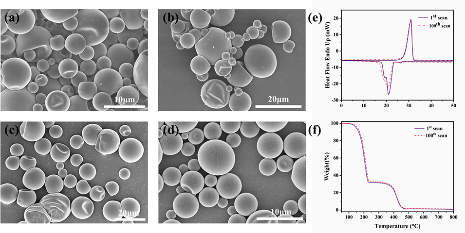图12 不同冷热循环次数下相变微胶囊的SEM显微图:(a)0次、(b)25次、(c)50次、(d)100次;100次循环后相变微胶囊的差示扫描量热(DSC)曲线(e)和热重分析(TGA)曲线(f)