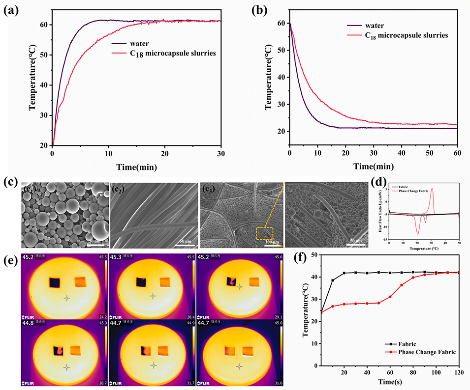 图13(a)60℃加热条件下,水与正十八烷微胶囊浆料的温度-时间曲线;(b)19℃冷却条件下,水与正十八烷微胶囊浆料的温度-时间曲线;(c)喷涂后相变微胶囊的SEM图像(c₁)、未处理织物的SEM图像(c₂)及喷涂相变微胶囊后相变织物的SEM图像(c₃、c₄);(d)未处理织物与相变织物的差示扫描量热(DSC)曲线;(e)不同加热时间下相变织物(左)与未处理织物(右)表面温度升高的红外热成像图;(f)不同加热时间下相变织物与未处理织物的表面温度曲线