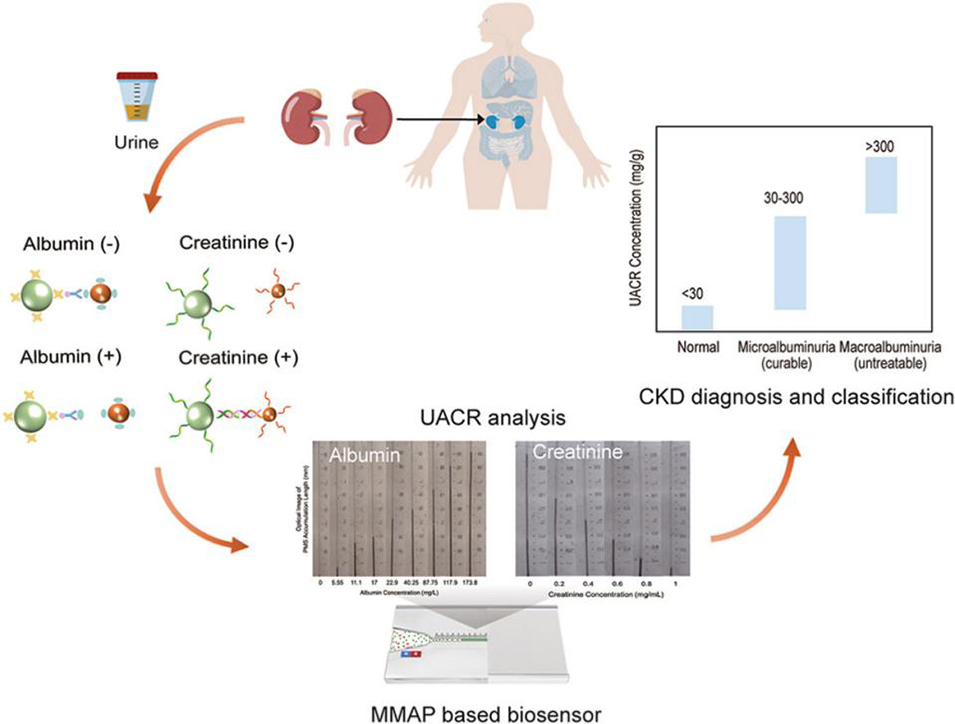 图1. 用于尿白蛋白/肌酐比值(uACR)检测的微流控微球累积平台(MMAP)生物传感器概述