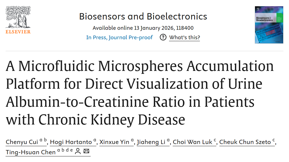 鉴于此,香港城市大学陈定璿教授团队开发了一种去中心化、无需仪器的微流控微球累积平台(MMAP),通过整合竞争性免疫测定与适配体识别技术,实现了尿白蛋白和肌酐的同步可视化定量。该平台借助微球累积长度直观反映标志物浓度并计算uACR,在临床样本检测中展现出与医院标准方法高度一致的准确性,且成本低廉、操作便捷。相关研究以“A Microfluidic Microspheres Accumulation Platform for Direct Visualization of Urine Albumin-to-Creatinine Ratio in Patients with Chronic Kidney Disease”为题目,发表在期刊《Biosensors and Bioelectronics》上。