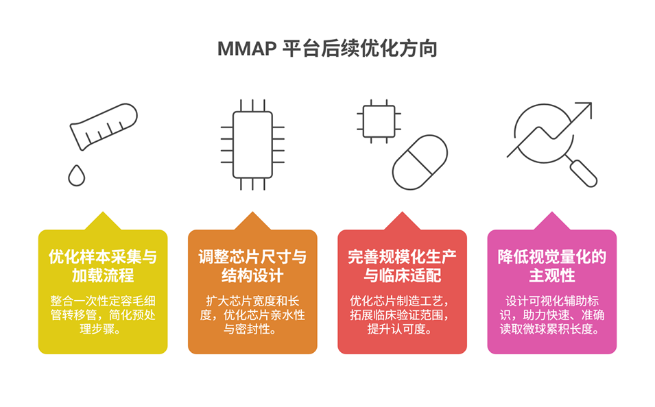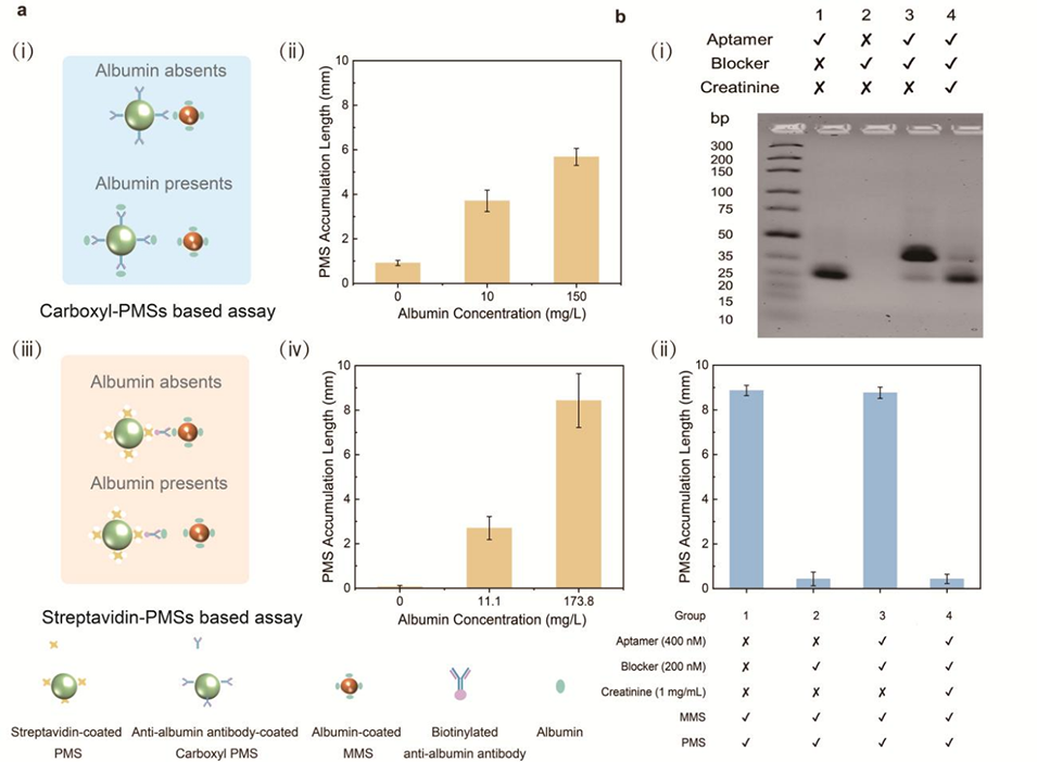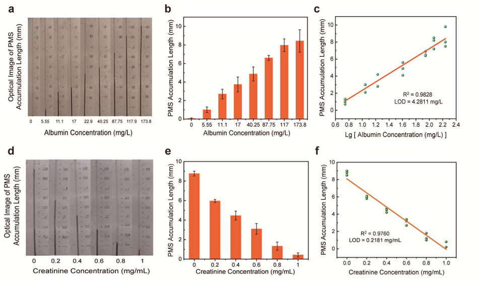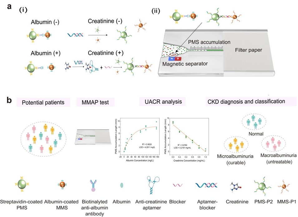 2、平台原理方面,白蛋白通过竞争性免疫分析抑制磁性微球(MMSs)与聚合物微球(PMSs)的结合,肌酐则通过抗肌酐适体识别释放DNA阻断链,促进MMSs与PMSs的连接;微流控芯片入口的磁分离器会吸附结合后的微球复合物,游离PMSs在滤纸毛细作用下聚集,其聚集长度可实现uACR的视觉定量。
