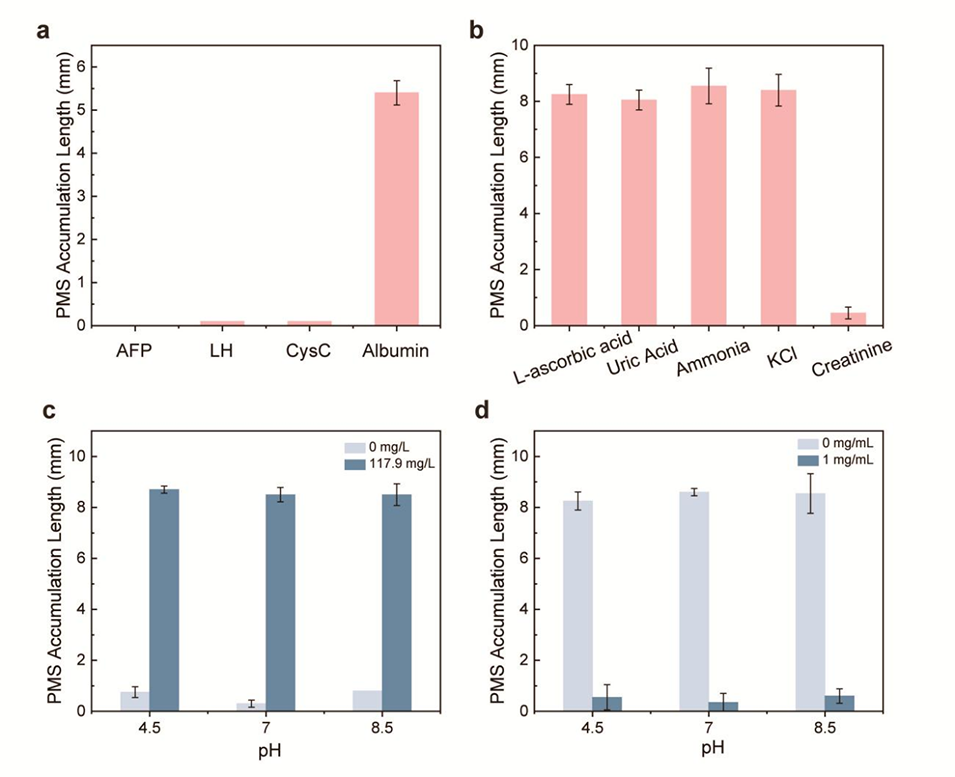 3、实验优化了PMSs浓度、抗体用量、反应时间等条件,该平台对白蛋白和肌酐检测的检出限分别为4.2811mg/L和0.218mg/mL,具有良好的选择性、pH耐受性和重复性。