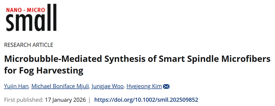 近期,韩国高丽大学研究团队提出一种微泡介导的微流控制备方法,利用蠕动泵产生的脉动流促使微泡聚并,结合热响应性聚(N-异丙基丙烯酰胺)(PNIPAm)基材料,成功制备出具有周期性纺锤结结构的智能纺锤微纤维(SSMs)。其独特的粗糙亲水表面与纺锤结-连接点结构延长了三相接触线、形成拉普拉斯压力梯度,配合PNIPAm的温敏润湿性调控,实现了0.046 g·min-1的雾水收集速率(为此前报道最高值的161%),且在温度循环中保持稳定性能,为干旱半干旱地区大规模雾水收集提供了高效解决方案。相关研究以“Microbubble‐Mediated Synthesis of Smart Spindle Microfibers for Fog Harvesting”为题目,发表在期刊《Small》上。