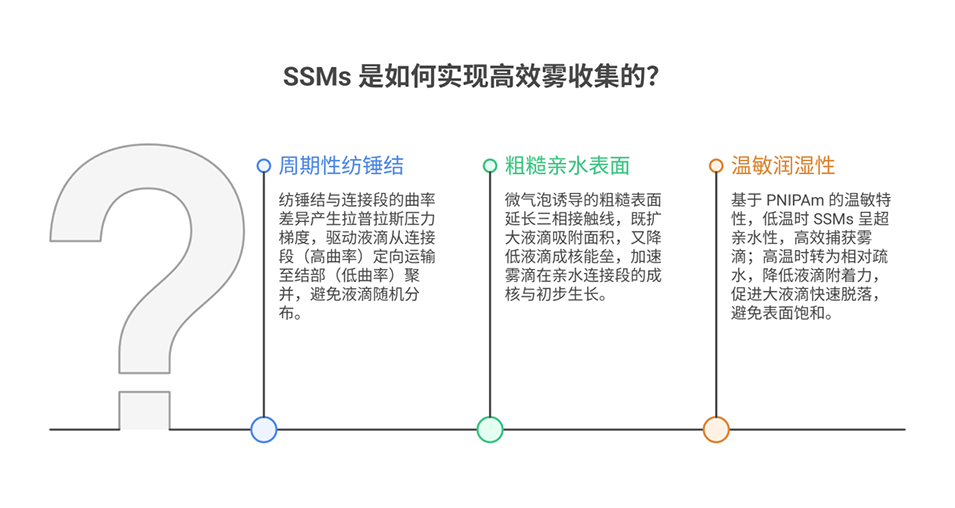 6、此外,SSMs具有良好的弹性和可拉伸性,可编织成不同交叉角度的纤维网络,且制备速度快,具备大规模应用潜力,为干旱、半干旱等水资源匮乏地区提供了高效的集水解决方案。