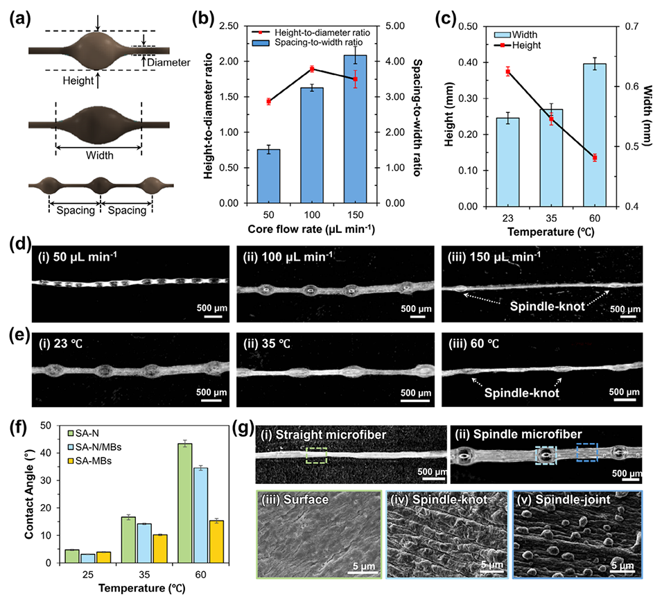 图2. SSMs 的形貌与表面特性。(a) SSMs 关键几何特征(高度、直径、宽度、间距)的示意图。(b) 微流控制备过程中核心流率与 SSMs 平均高径比、间距-宽度比的关系。(c) SSMs 高度和宽度的温度依赖性。(d) 不同核心流率下制备的 SSMs 形貌光学图像:(i) 50 μL・min-1,(ii) 100 μL・min-1,(iii) 150 μL・min-1。(e) 不同温度((i) 23℃、(ii) 35℃、(iii) 60℃)对 SSMs 形貌影响的光学图像。(f) SA-N、SA-MBs 和 SA-N/MBs 水凝胶在不同温度下的接触角变化。(g) (i) 直微纤维和 (ii) SSMs 的光学图像;(iii) 直微纤维表面、(iv) SSMs 纺锤结处、(v) SSMs 连接段粗糙表面的扫描电子显微镜(SEM)图像。