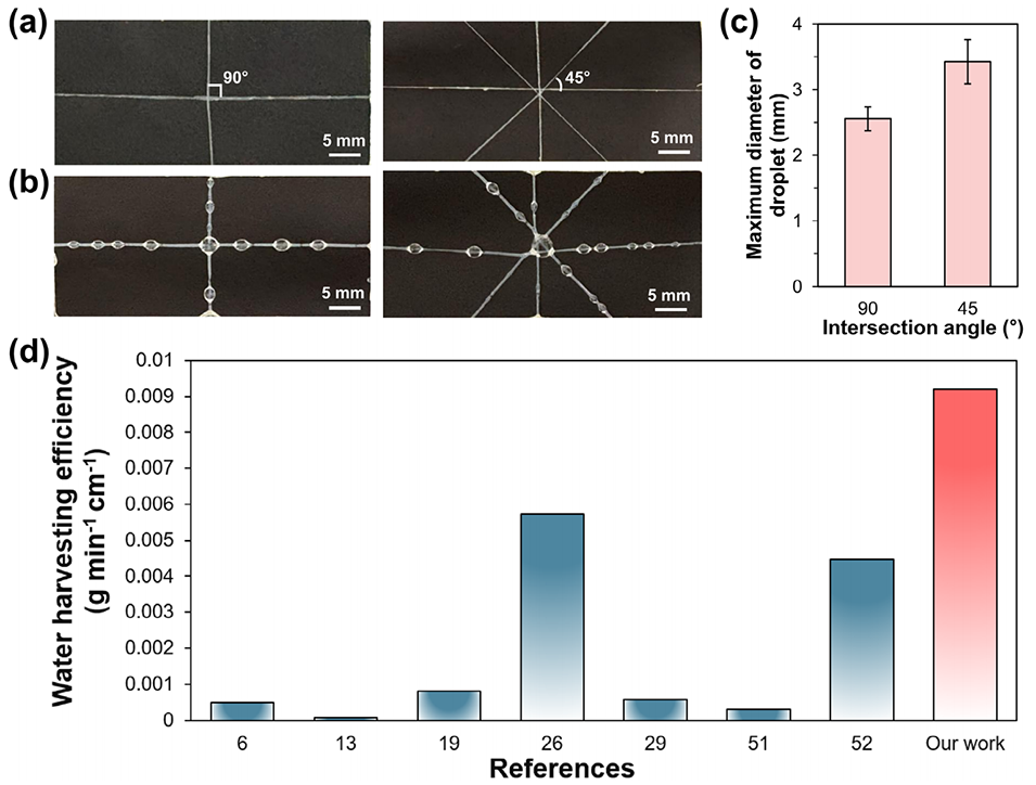 图5. 大规模集水用 SSMs 纤维网络。不同交叉角度(45° 和 90°)编织的 SSMs 纤维网络:(a) 初始编织结构,(b) 对应的集水状态。(c) 不同交叉角度下的最大液滴直径。(d) 各类已报道微纤维的雾收集效率对比,本研究制备的 SSMs 表现最优(数据来源于不同实验条件下的已发表文献)。