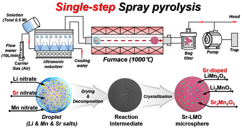 多相锂锰氧化物微球正极材料(Sr-LMO)通过单步喷雾热解工艺制备,无需后续处理,过程简洁且可规模化,具体步骤如下: