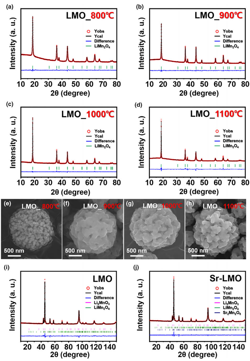 图1 (a) LMO_800°C、(b) LMO_900°C、(c) LMO_1000°C、(d) LMO_1100°C 的 X 射线衍射(XRD)精修图谱;(e)–(h) 800–1100°C 温度下合成的 LMO 高倍率场发射扫描电子显微镜(FE-SEM)图像;(i)、(j) 分别为 LMO 和 Sr-LMO 的中子衍射(ND)精修图谱。