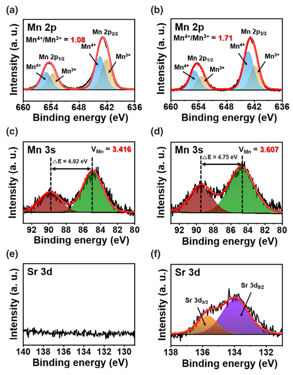 图4 LMO 样品的 X 射线光电子能谱(XPS)窄扫图谱:(a) Mn 2p 轨道、(b) Mn 3s 轨道、(c) Sr 3d 轨道;Sr-LMO 样品的 X 射线光电子能谱(XPS)窄扫图谱:(d) Mn 2p 轨道、(e) Mn 3s 轨道、(f) Sr 3d 轨道。