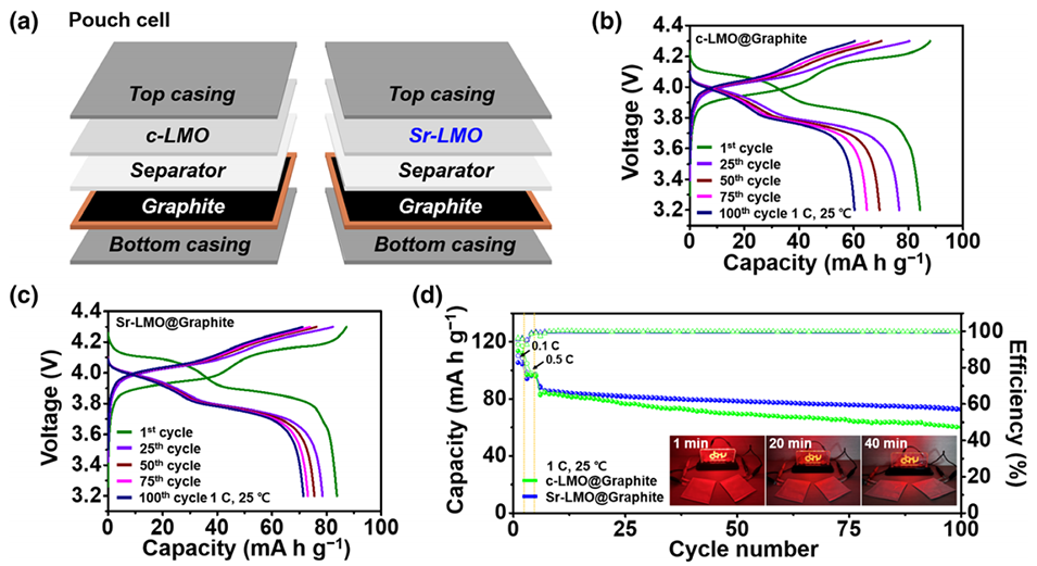 图8 软包型全电池的电化学表征:(a) 分别采用 c-LMO(商业 LMO)和 Sr-LMO 作为正极的软包电池结构示意图;(b) c-LMO@石墨全电池的充放电曲线;(c) Sr-LMO@石墨全电池的充放电曲线;(d) c-LMO@石墨和 Sr-LMO@石墨全电池在 1C 倍率下的循环性能(插图:8V 发光二极管由该电池供电发光 40 分钟,验证器件实用性)。