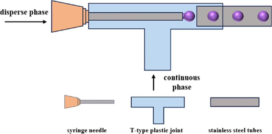 1、微流控装置的结构化设计:采用流动聚焦型微流控装置,由注射器针头、T 型塑料接头和不锈钢毛细管组装而成,确保分散相(油相)在连续相(水相)中形成单分散液滴。装置组装时严格保证中心轴同轴对齐,固定于载玻片以避免操作中偏移,从源头控制液滴生成的一致性。
