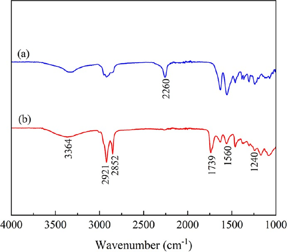 图4 微胶囊的红外光谱图:(a)IPDI 的红外光谱;(b)微胶囊壳层的红外光谱