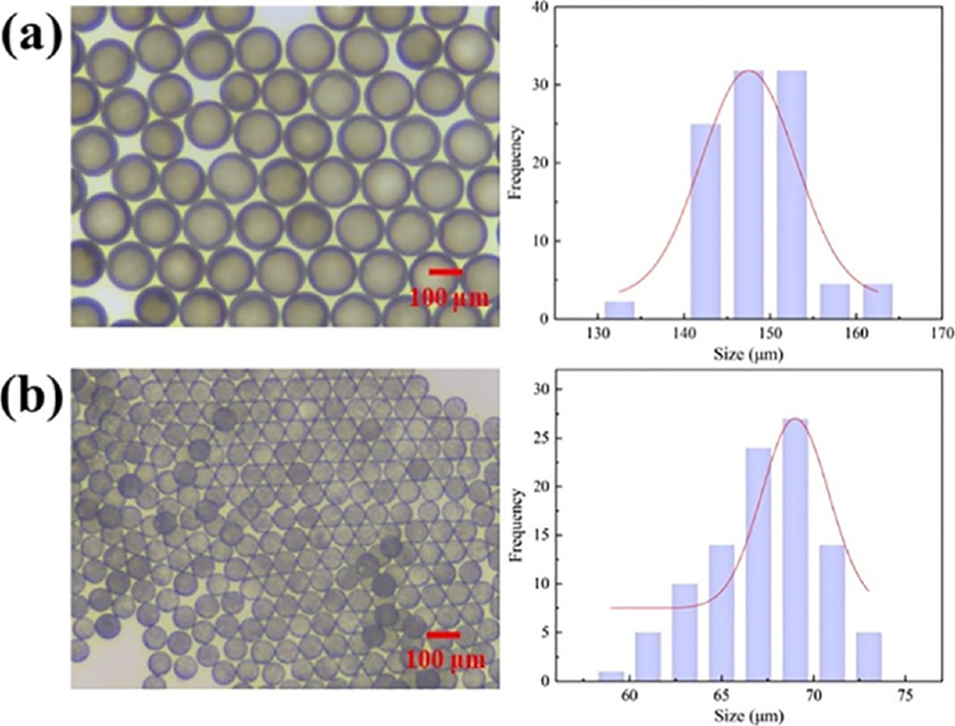 图5 乳液与微胶囊的光学显微镜图像:(a)乳液液滴的粒径分布与形貌;(b)微胶囊的粒径分布与形貌