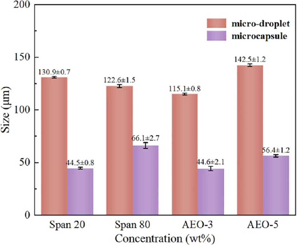 2、微胶囊最小粒径约 44.5μm,平均直径 67.4μm,在轻质油和重质油中均展现出快速靶向释放特性,重质油中 10s 内即可完全溶解;封装 AEO-3 表面活性剂的微胶囊能将油水界面张力从 27.68mN・m⁻¹ 降至 6.67mN・m⁻¹,0.1wt% 浓度时分散体系 Zeta 电位达 - 36.12±0.7mV,稳定性良好,且在 80℃高温、10wt% NaCl 与 7wt% CaCl₂高盐条件下可保持形态完整。