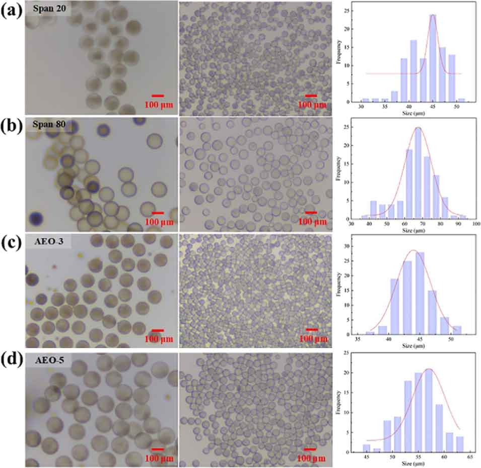 图7 芯材类型对乳液及微胶囊的影响:(a)Span 20;(b)Span 80;(c)AEO-3;(d)AEO-5
