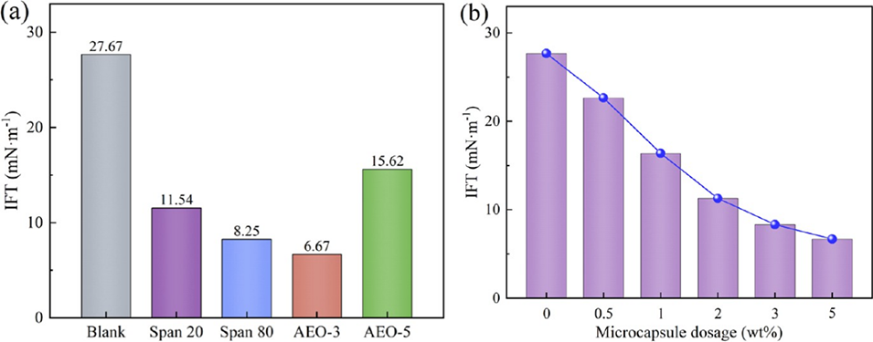 图11 油水界面张力测试图:(a)封装不同表面活性剂的微胶囊;(b)封装 AEO-3 的微胶囊