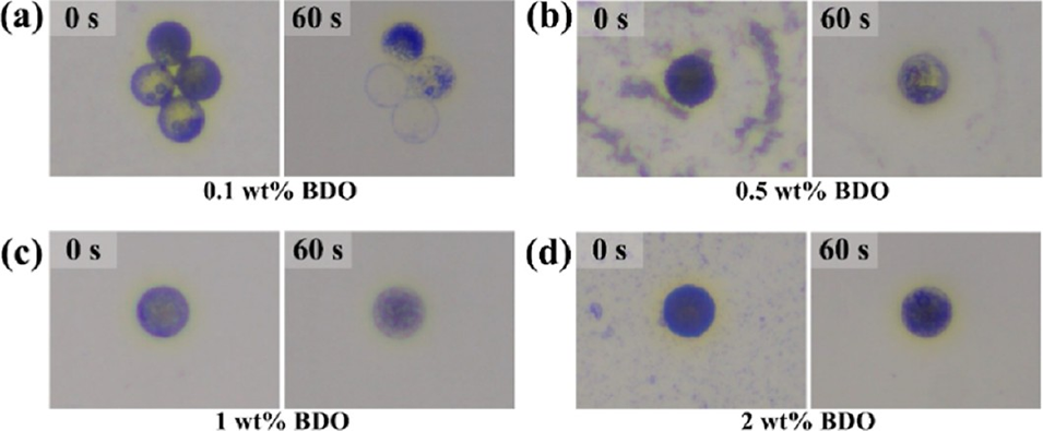 图17 不同扩链剂用量制备的微胶囊在重质油中溶解的光学显微镜图像:(a)0.1wt% BDO;(b)0.5wt% BDO;(c)1wt% BDO;(d)2wt% BDO