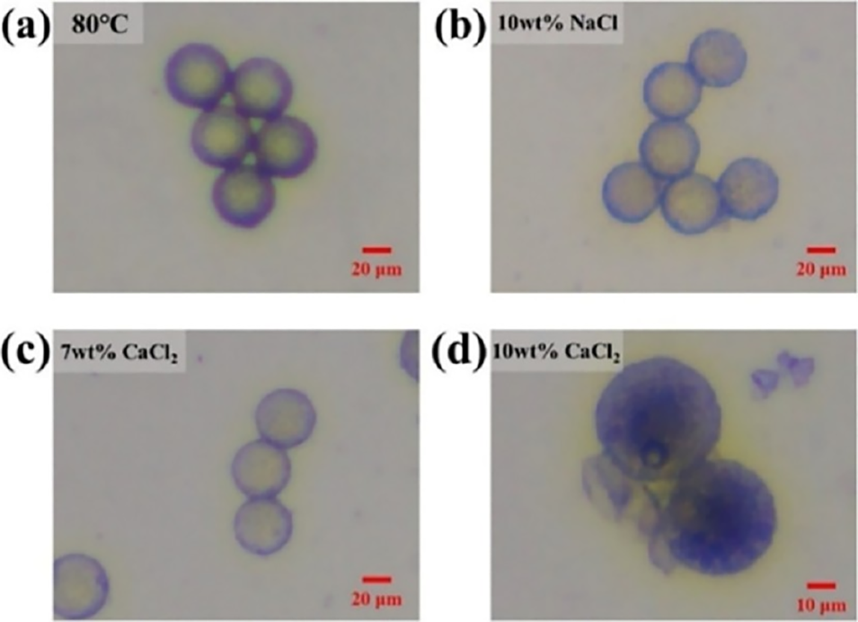 图20 微胶囊在(a)高温或(b-d)高盐条件下静置 48 小时后的光学显微镜图像:(a)80℃;(b)10wt% NaCl;(c)7wt% CaCl₂;(d)10wt% CaCl₂