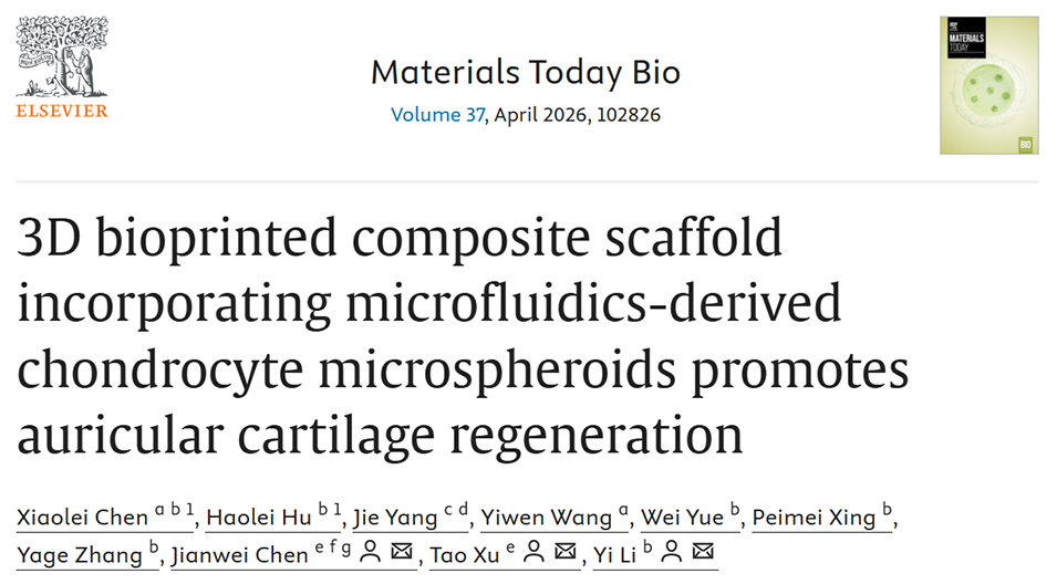 近期,联勤保障部队第九八八医院耳鼻喉科李谊教授联合深圳清华大学研究院生物智能制造和活体打印研发中心主任徐弢、副主任陈建伟等人创新性融合微流控技术与3D生物打印,构建出兼具结构保真度与生物活性的双相复合支架,成功在动物模型中实现接近天然耳廓软骨的再生效果。相关研究以“3D bioprinted Composite Scaffold Incorporating Microfluidics-Derived Chondrocyte Microspheroids Promotes Auricular Cartilage Regeneration”为题目,发表于期刊《Materials Today Bio》。